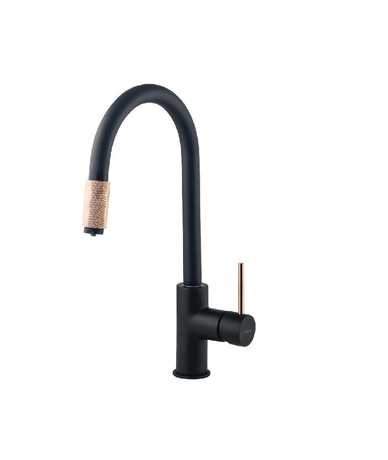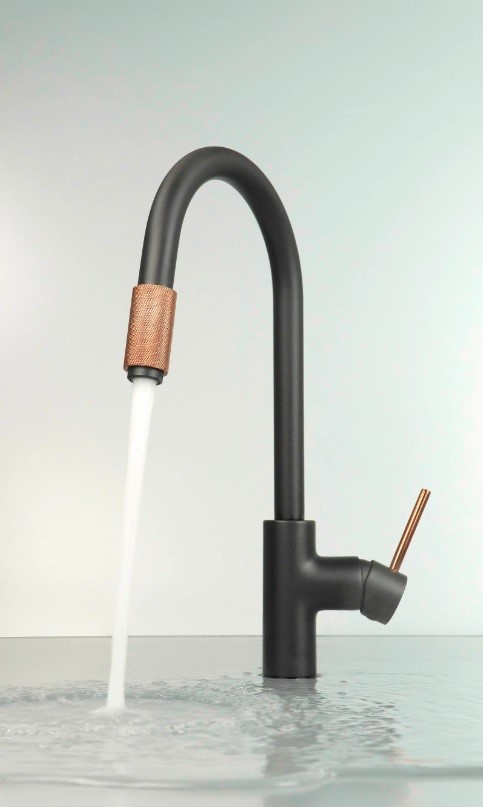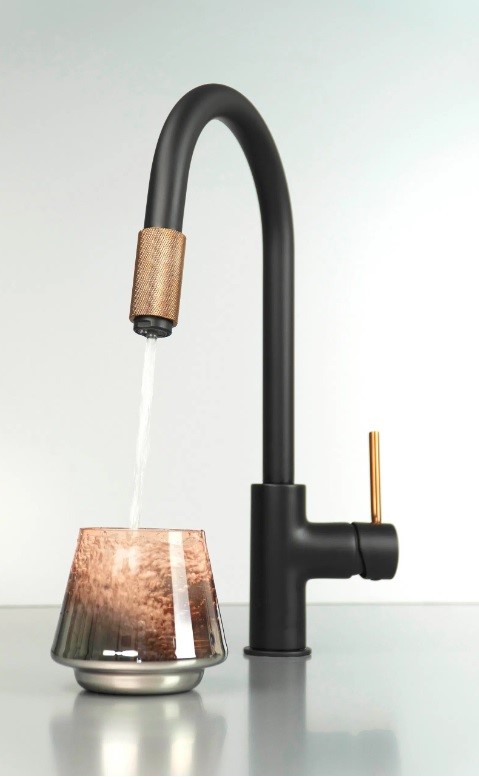 Bateria kuchenna Aster oprócz podłączenia do ciepłej i zimnej wody posiada także przyłącze do urządzenia filtrującego. To rozwiązanie idealne dla osób, które w kuchni cenią sobie wygodę i szybkość działania. Należy jedynie wcześniej zamontować urządzenie do filtrowania wody. W zestawie znajduje się szybkozłączka oraz wężyk 1/4" o długości 100 cm (to najczęściej występująca średnica wężyka dla przyłączeń tego typu) umożliwiające podłączenie filtra. Mosiężny przełącznik funkcji na końcu wylewki jest bardzo intuicyjny – wystarczy go przekręcić, aby zmienić wodę z kranu na przefiltrowaną, gotową do picia. Baterię Aster można również używać bez konieczności podłączenia urządzenia filtrującego, przełącznik funkcji powinien być wtedy w pozycji poboru wody z sieci. Solidna czarna bateria kuchenna z mosiądzu jest wykończona miedzianymi akcentami. Świetnie komponuje się z innymi elementami wyposażenia zarówno w nowoczesnych, jak i bardziej tradycyjnych aranżacjach.