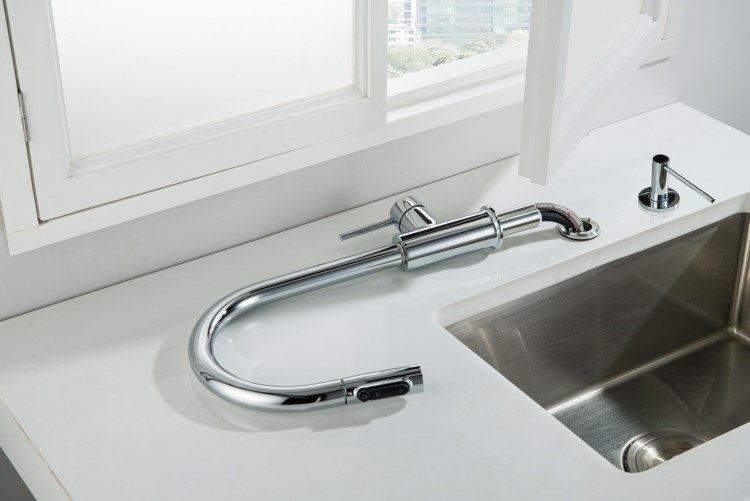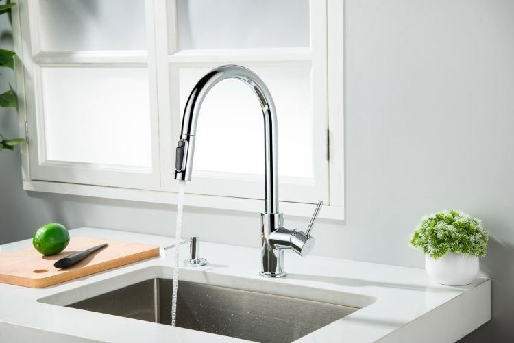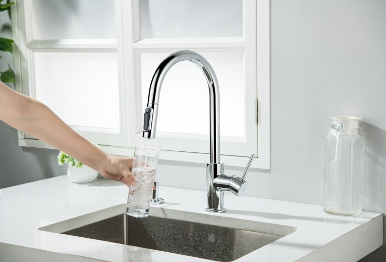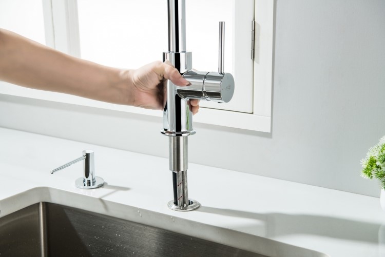 Bateria DIANA na wyciąganej wylewce (końcówce) ma 2 przyciski (jeden to przełącznik strumienia wody, drugi (okrągły) do uruchomiania wody filtrowanej.