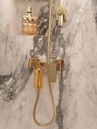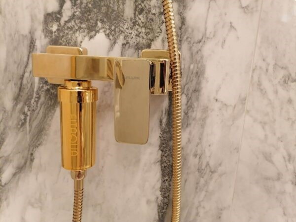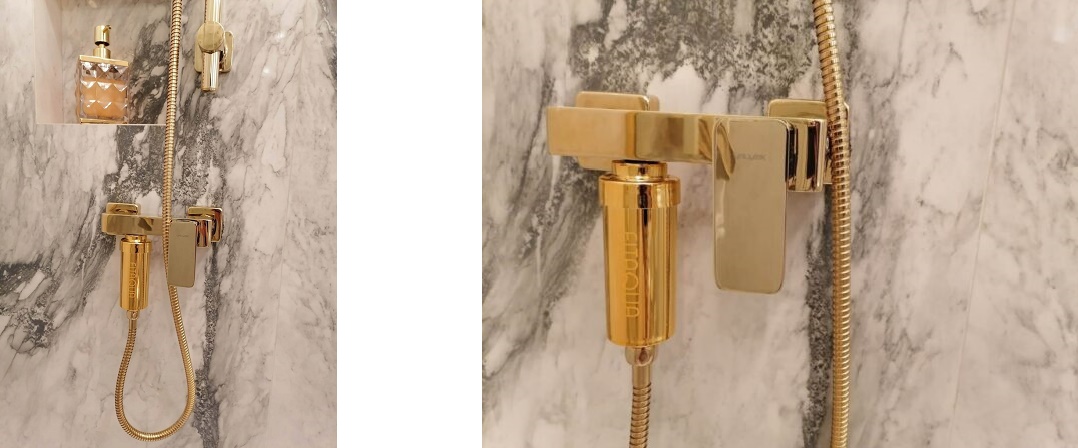 Najnowszy produkt naszej marki – filtr prysznicowy FITaqua w kolorze złotym z laserowo wykonanym nadrukiem.