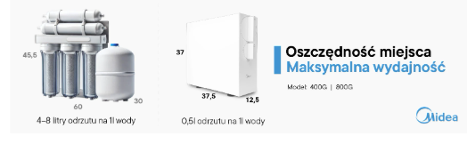 Filtr osmotyczny Midea odznacza się bezzbiornikową konstrukcją, która pozytywnie wpływa na gabaryt systemu. Kompaktowe wymiary 37,5 x 12,5 x 37 cm (gł. x szer. x wys.) ułatwiają montaż pod zlewem, redukując konieczność rearanżacji układu pozostałych sprzętów kuchennych.