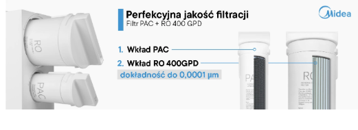 System odwróconej osmozy Midea wykorzystuje dwa wkłady filtrujące: hybrydowy PAC oraz membranę osmotyczną 400GPD, które oczyszczają wodę z zanieczyszczeń takich jak metale ciężkie, osady i bakterie, zapewniając doskonałą jakość wody pitnej. Filtr osmotyczny Midea MRO2489C-400G dedykowany jest dla gospodarstw domowych wykazujących zwiększone zapotrzebowanie na świeżą, czystą i smaczną wodę prosto z kranu. Kompaktowa konstrukcja i wysoka efektywność czynią ten model idealnym wyborem dla osób poszukujących niezawodnego i oszczędnego systemu filtrującego wodę.