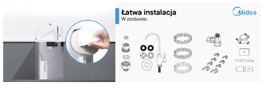 Filtr odwróconej osmozy Midea został zaprojektowany z myślą o maksymalnej wygodzie użytkowników, co przekłada się na szybki i intuicyjny montaż oraz prostą obsługę. Dzięki kompletnemu zestawowi akcesoriów montażowych urządzenie jest gotowe do instalacji bez konieczności dokupowania dodatkowych elementów. Instalacja może być wykonana samodzielnie w zaledwie kilkadziesiąt minut, nawet przez osoby bez doświadczenia w montażu urządzeń tego typu. Prosta konstrukcja systemu połączona z przejrzystą instrukcją eliminuje ryzyko błędów podczas instalacji, zapewniając bezpieczne i stabilne działanie.