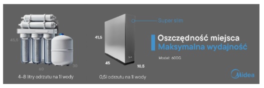 Midea 600GPD to nowoczesny system odwróconej osmozy wyróżniający się wyjątkowo niskim zużyciem wody. W tradycyjnych filtrach na każdy litr czystej wody przypada nawet 4–8 litrów wody odrzuconej, co prowadzi do dużych strat i wyższych kosztów użytkowania. Filtr Midea zmienia te proporcje – na , pozwala to oszczędzać wodę i dbać o środowisko, a także zmniejsza koszty eksploatacji. Midea 600G jest ekologicznym i ekonomicznym wyborem łączącym wygodę użytkowania z troską o planetę. Odrzut wody może być większy w sytuacji gdy woda sieciowa ma zbyt niskie ciśnienie - proces osmozy nie jest wtedy przeprowadzany efektywnie, co prowadzi do zwiększonego odrzutu.