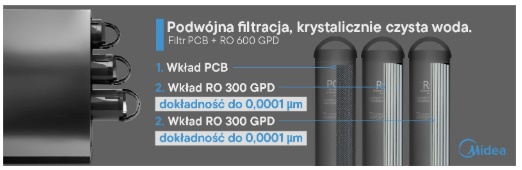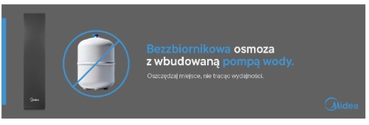 Wysoka wydajność osmozy Midea wynoszącą do 1,5 litra wody pitnej na minutę jest możliwa do uzyskania dzięki wykorzystaniu dwóch membran oraz zintegrowanej pompy utrzymującej odpowiednie ciśnienie wody. Zastosowanie nowoczesnych rozwiązań technologicznych umożliwiło także ograniczenie odrzutu wody, który w optymalnym środowisku wynosi nawet 1 litr wody odrzuconej na 2 litry przefiltrowanej!