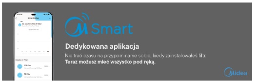 Filtr Midea wyposażony jest w moduł Wi-Fi oraz dedykowaną aplikację mobilną, która zapewnia stały dostęp do parametrów urządzenia z dowolnego miejsca na ziemi. Po sparowaniu systemu filtrującego z aplikacją użytkownik może na bieżąco monitorować parametry wody oraz stopień zużycia wkładów filtrujących. Aplikacja przypomina także o konieczności wymiany wkładów filtrujących, co pozwala na utrzymanie najwyższej jakości wody w Twoim domu i ułatwia planowanie akcji serwisowy oraz ewentualnych przestojów w dostępie do świeżej wody.