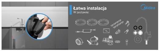 Filtr odwróconej osmozy Midea został stworzony z myślą o komforcie użytkowników. Jego montaż i obsługa są niezwykle proste, nie wymagają specjalistycznej wiedzy lub wielu godzin spędzonych na instalacji. Dzięki dołączonemu zestawowi akcesoriów montażowych nie trzeba martwić się o dokupowanie dodatkowych elementów – wszystko, co potrzebne, znajduje się w komplecie. Instalację można przeprowadzić samodzielnie w krótkim czasie, nawet bez wcześniejszego doświadczenia w tego typu pracach. Przemyślana konstrukcja systemu oraz czytelna instrukcja sprawiają, że proces instalacji jest bezproblemowy, a urządzenie działa stabilnie i niezawodnie od pierwszego uruchomienia.