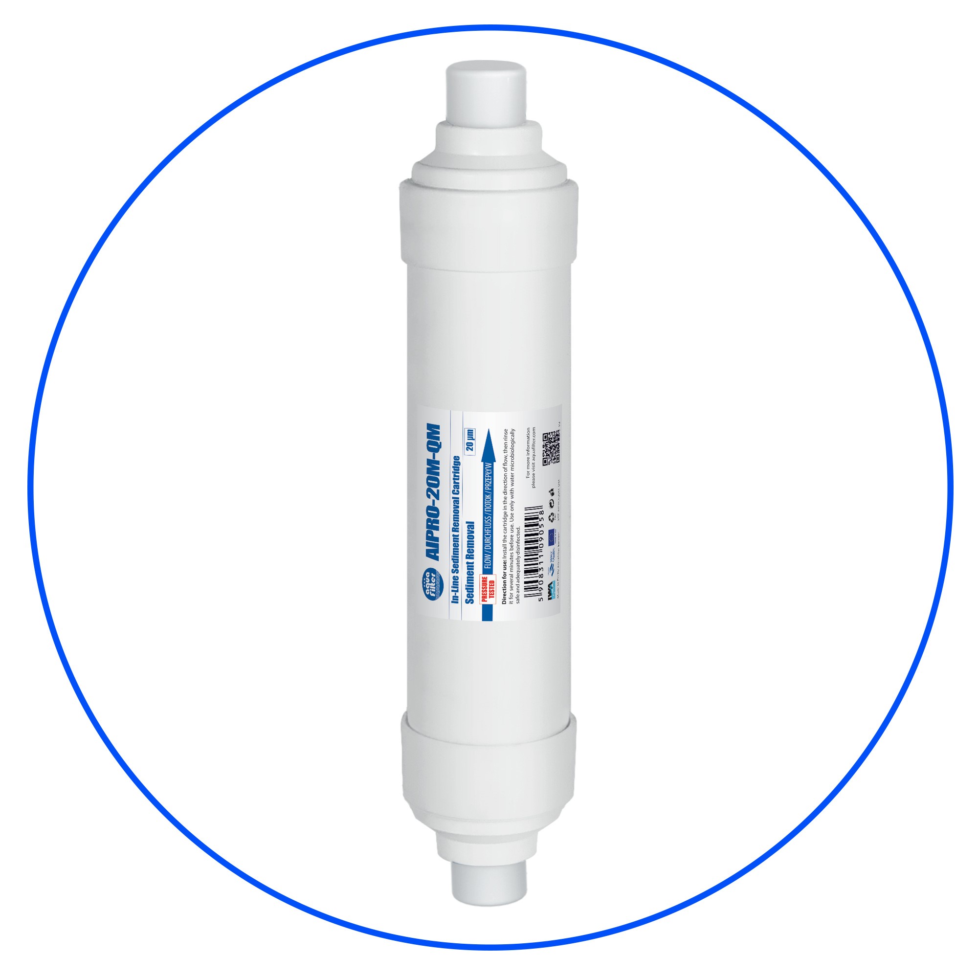 Liniowy filtr mechaniczny (sedymentacyjny) stosowany do wstępnej filtracji wody w zabudowanych filtrach odwróconej osmozy oraz akwarystycznych systemach uzdatniania wody.Wkład AIPRO-20M-QM skutecznie zatrzymuje wszelkie nierozpuszczone w wodzie zanieczyszczenia, większe od 20 mikronów. W systemach uzdatniania wody firmy Aquafilter, stosowany do wstępnego uzdatnienia wody, zatrzymania zgrubnych zanieczyszczeń oraz zabezpieczenia kolejnych, znajdujących się w filtrze wkładów, przed zapchaniem ich przez większe frakcje zanieczyszczeń, typu piach, muł itp.